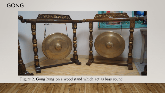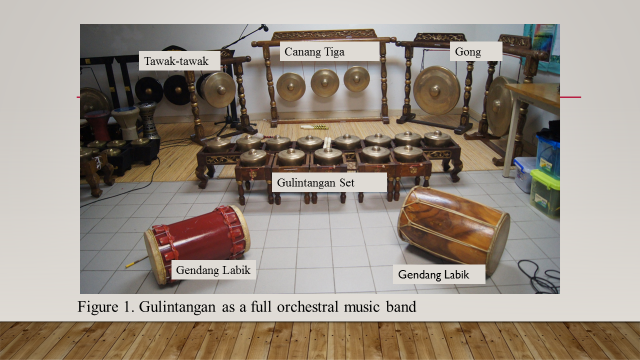 Gulingtangan (literally ‘rolling hands’) is a series of small gongs in a casing made from the special wood of timbaran. The gongs are struck with wooden sticks to create melodies. It is played with other traditional instruments in the orchestra, typically consisting of Gongs, Canang Tiga, Tawak-tawak, 2 sets of Gendang Labik along with Gulintangan set. Modern musical instruments may also be added on to the ensemble. Although songs and instruments have evolved to include modern music, Gulintangan is at the heart of the orchestral band.