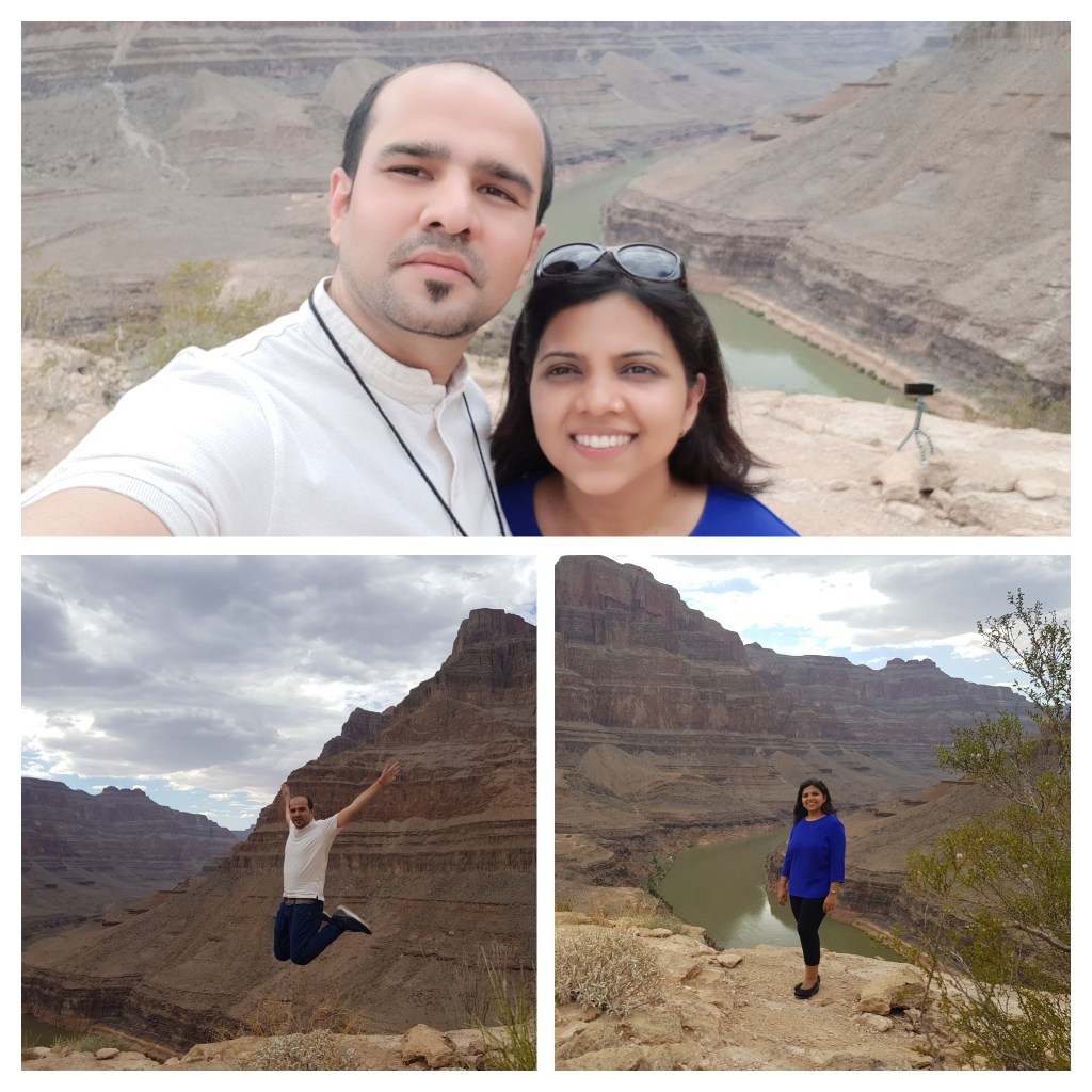 We flew over Lake Mead and landed in the fascinating landscape of the Grand Canyon. It felt meditative as we stood at the rim of the Grand Canyon gazing at layer upon layer of rock. It was quite breezy and as the light wind splashed across our faces, we felt a renewed vigor and sense of surrender to the mighty nature ahead of us. We had time to take several pictures of the iconic landscape.